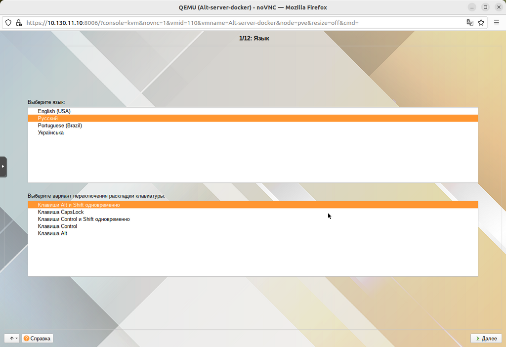 Install ALT Server 10.1 x86_64 - Выберите язык и вариант переключения раскладки клавиатуры.